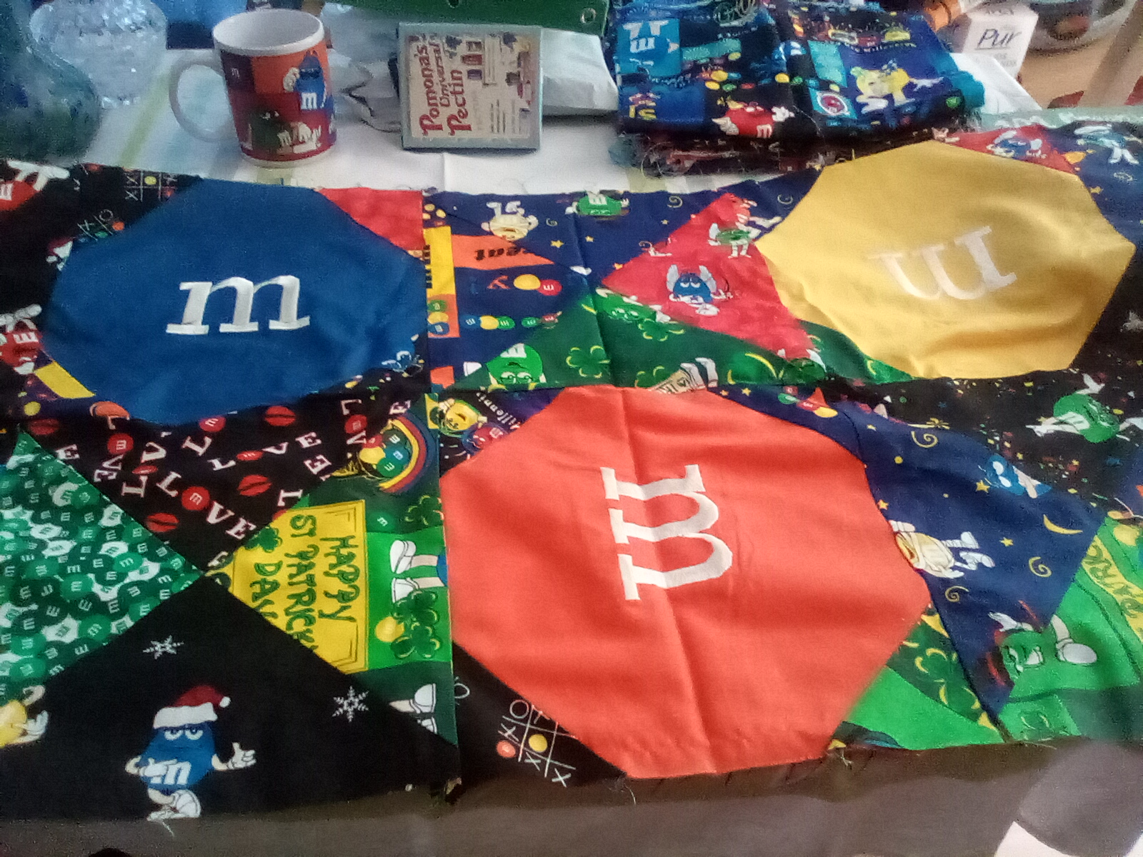 Daniel, thank you for your kind words. Here is one of the squares I was talking about in one of the posts. This is back when M&M fabric was everywhere. And it is thicker. I took a package of m&MS in and matched the colors. I know for this one I wanted it to look like a handful of candy was just dropped which is why some have an "m" and others do not. And the "m"s will be all different directions. These are snowball pattern.