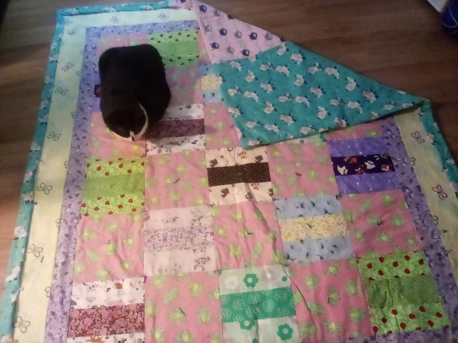 I just need to sew the edges and this quilt is finished. The colors AR not as muted as the pictures show. The backing as a turquoise. The teacher is having her in a couple weeks so I actually will have the quilt done just in time. And, of course, something was on the floor so Minney had to lay on it.She put a few wrinkles in it but it lays flat when she doesn't decide to walk and play before lying down. 17256701546041332333239963205587.jpg 17256702279202079865809223324978.jpg 17256703425954546773876232613663.jpg