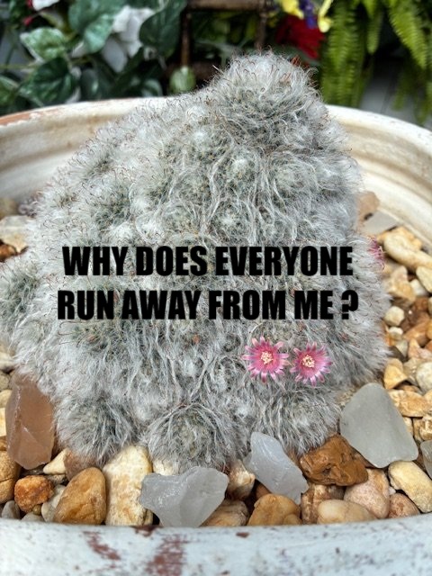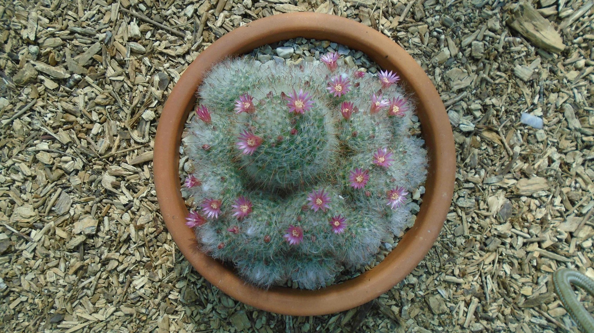 I think I've seen Cousin It before Yep, he's a Mammillaria, the spines look like bocasana, and the clumping habit is very similar. Just the shape that's throwing me off a bit. I've seen Mammillaria hahniana, multi headed form looking like that but they don't have the hooked spines so I might stick with bocasana. Here's one I've got in flower at the moment...