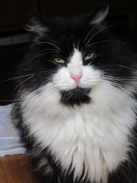 Eileen,..the Vet said there was no marks on the outside,..so not a bite or injury recently,..shortly after that loss another cat 'Tux' was looking poorly,..it was Leukaemia,..the Vet could boost him up but at the first sign of any illness he would be suffering,..'Tux' had to be put down. 'Tux'. 'Tux' and 'Blind Pew' always cuddled up at night,..went out during the day and night together,..Tux always leading,..the were like that from kittens,..anyway when Tux died Pew was out of sorts so i paid more attention to Pew,..on the 20th of Jan Pew went out for his usual midnight wandering and never came back,..i took the pictures below just before he went outside. In the garden some days before.