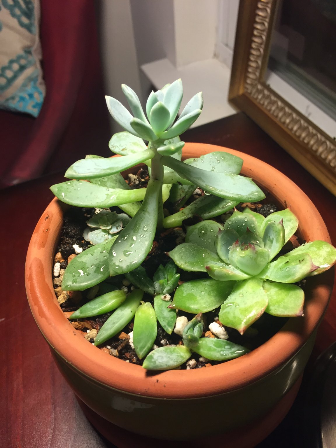 Thank you for the advice - much appreciated as I'm really new to this. The succulent cuttings that I'm attempting to propagate are in tiny glass votives with no drainage. I just made some small clay pots at home WITH drainage so they will be living in those soon. The little group of repotted succulents in the middle - does it look like there are too many in there? Makes sense that the roots would become difficult to manage. I read that succulents like to be crowded so I just went for it. If you think that's too much, I will separate some out in another pot with drainage. Really want them to do well. So far the reppoted succulents seem to be doing well in their new home with their new gritty mix - no visual concerns yet. Fingers very much crossed. No sign of anything happening with my cuttings though. I've been misting them lightly every few days per the consensus I found online. They've all calloused over, just nothing else happening. I hope they'll materialize! Mom's money plant cuttings are in water with leaves exposed but the root nodes submerged. Hope I will get a baby money plant going!