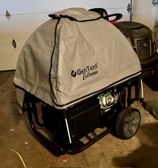 Today I set up a "tent" cover for the emergency power generator. If the power lines are down due to ice or snowstorms - happens every year - this will power a heater, fridge, hot plate etc to keep me going for a while. Here it is in the garage.