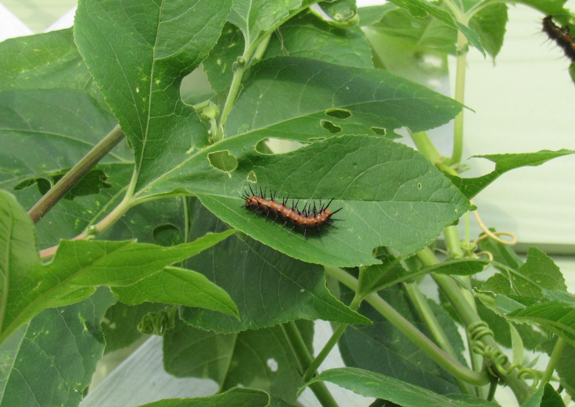 Our Monday started off on a high note! On the way to the coop we noticed our Passion Vine had developed instars. It is a host plant for Gulf Fritillary butterflies, which at this stage are not pretty (understatement) but develop into a lovely butterfly. The Passion Vine is home to both the instar stage and the chrysalis.Here is the instar, with chrysalis to come!