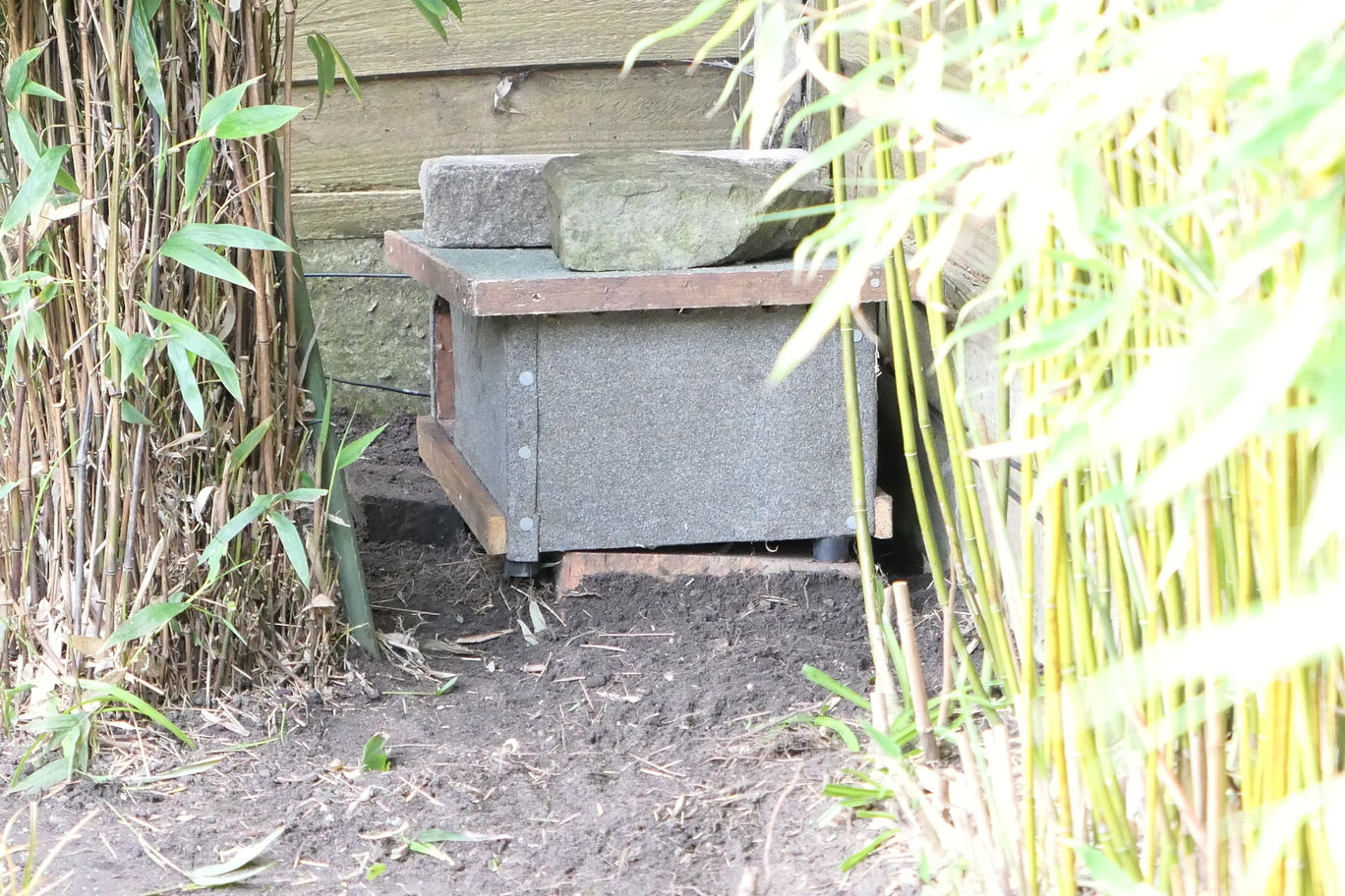 I was down on my hands and knees positioning the house which was a bit awkward, as I'd put doorstops as feet at each corner for when it sat on the paving slab under the azaleas. I'd only two bricks so only one foot would fit on each. I had to position it so rain would run off the roof away from the sleeping area. It looks a bit precarious, but it's quite secure. "Whilst I was down there," I cleared the whole bed of dying bluebells.