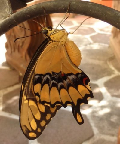 O happy day! The Giant Swallowtail butterfly (fka "Cutie Pie, the caterpillar) eclosed today after 12 days in the chrysalis. I moved him (yes, it's a boy!) outside to the patio table as soon as he got a firm grasp on things. Healthy and apparently with all