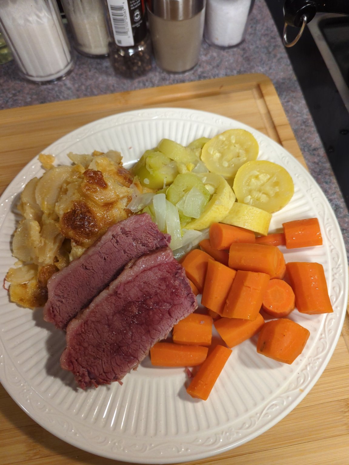 Dinnier tonight is home made Corned Beef, Carrots, Zucchini and Yellow Squash with a large Vidalia sweet onion, Russet Potatoes Au gratin.