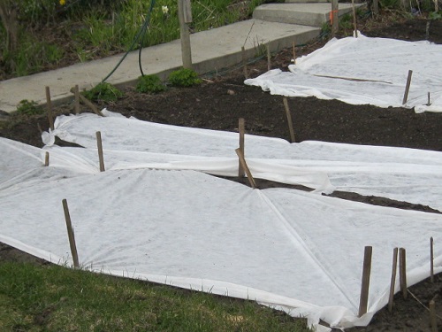 It is still very cold for spring. Every seeding is covered with remay to try and keep the soil warmer. I prepped the squash bed yesterday and turned it over. Then covered it with clear plastic to warm the soil. Squash seeds were planted in 500 ml milk containers for easy transplant. Fingers crossed temps become more seasonal by the time they have to go into the ground.