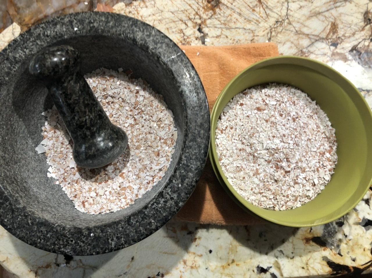 I used to use the food processor for that, but I was concerned the eggshells might dull the blades and abrade the plastic parts. Mortar and pestle are just as easy, and nothing to damage. If we can't get layer food for the hens, I add eggshells to that. Mostly they go into garden beds for calcium.