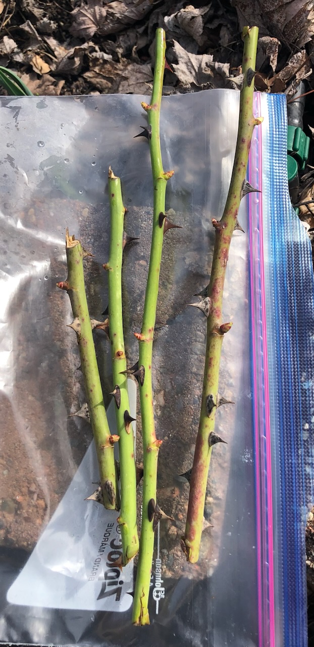 Then on return, I tried my hand at grafting roses. I want a climbing rose at this location. The cutting I started two years ago was supposed to be a peach-colored rose from a neighbor's trimming, but after it grew, I suspect it was a sucker from the rootstock. No bloom last year. So, I collected a known climbing rose scion during the winter, to try grafting. Those were in a plastic bag in the fridge until now. By grafting, I hope not to lose 2 years of growing roots as opposed to starting fresh from cuttings again.