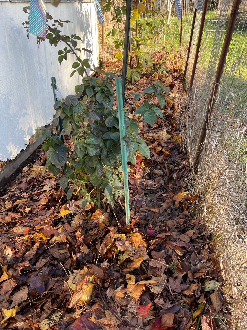 As for me, I finished distributing that first truckload of leaves, mostly in my mini- orchard and around the rest of the blackberries. The blackberries are cleaned up, and soil removed from beside the shed, so that's a completed task now. With the leaf mulch renewed, these will be very low maintenance until berry harvest in July / August. I don't chop the leaves, because that's more work, plus I want the mulch to last until next fall.