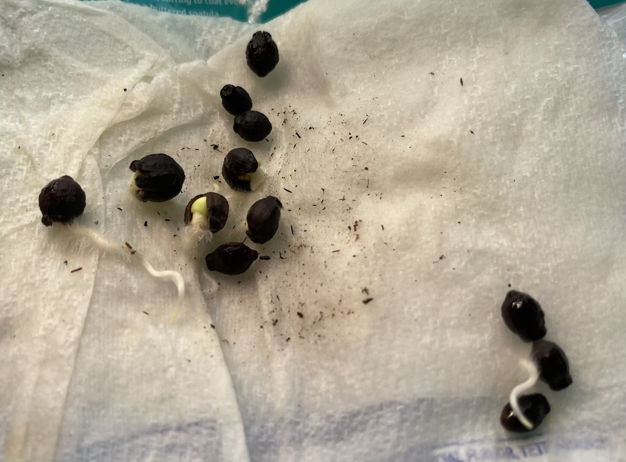 The Four O'Clock seeds that I soaked, then wrapped in moist paper towel + plastic bag, and stored on warming mat, germinated in three days. I transferred to to potting soil.