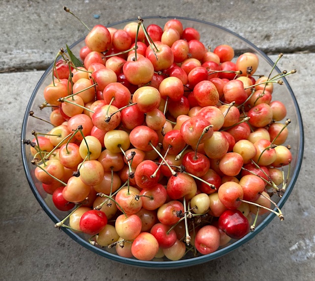 I was able to get some of my cherries this year. Mine are sour pie cherries, but yummy. The trees are tall, and I cannot reach them all. I was happy to get the ones I can reach.