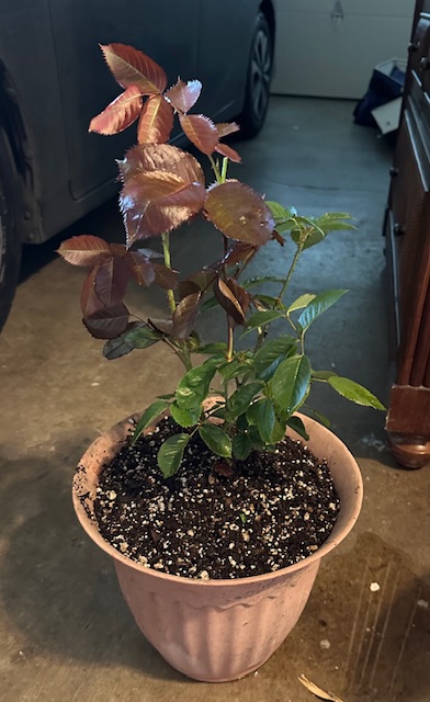I potted up another young rose, grown from a hardwood cutting that I stuck into a vegetable bed last fall. I can't find a photo of the flower. I think it's an antique variety.