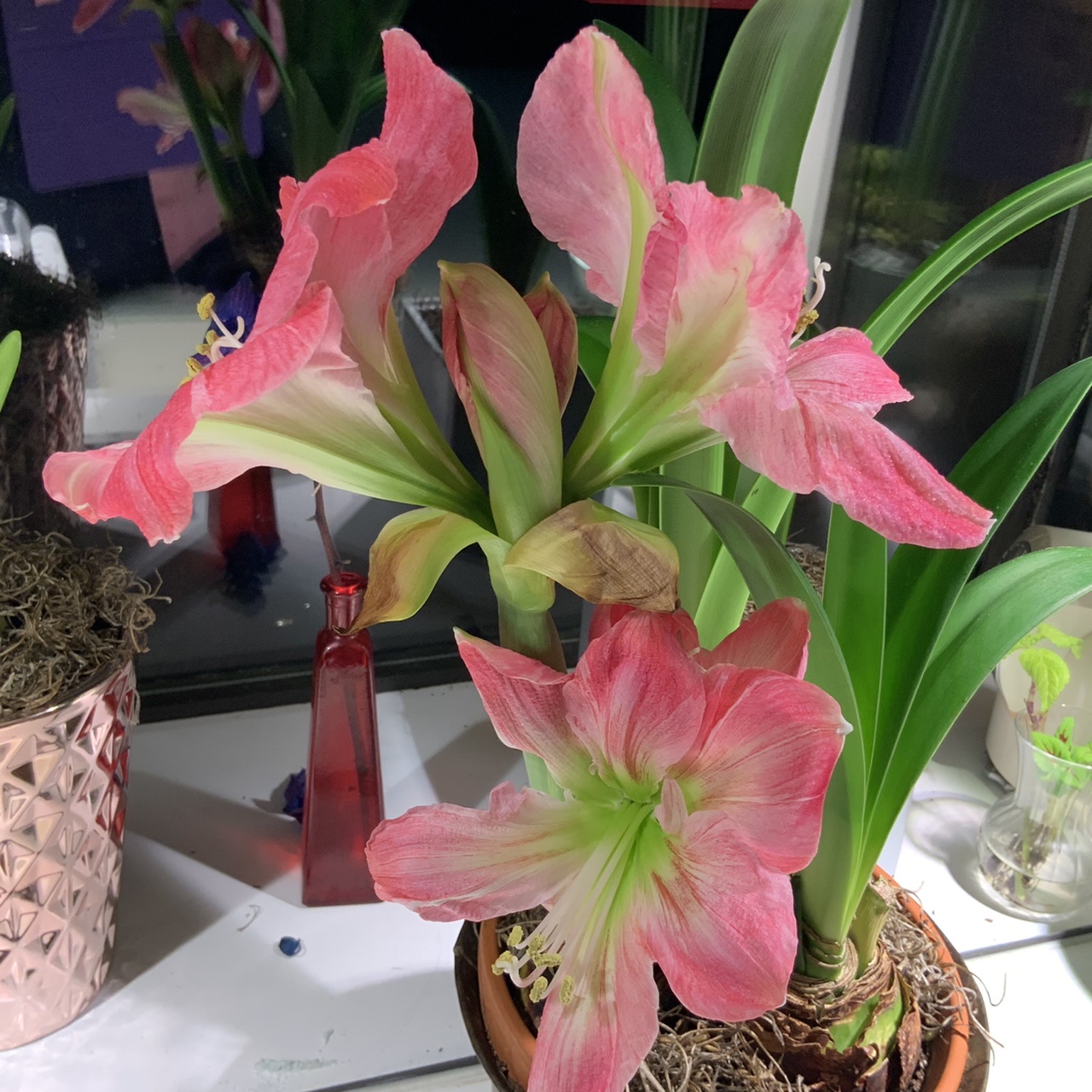 Very nice system you have with propagating that beautiful cactus. It well balances some can get a bit twerky. They are so pretty this time of year . I had a really nice once and very prickly those tiny hairs on them are sharp. One day my collie was chasing the cat and the cactus caught her tail and she flung around and so did the cactus in a million pieces. She was so scared that she just froze couldn’t move… it took hours to clean out all the cactus pieces from her long furry coat. She earned a big cookie for being so patient while sorting out the pieces from her fur coat. Some amaryllis do seems to have a slow start. But once they get going they never disappoint. Can’t wait to see it!