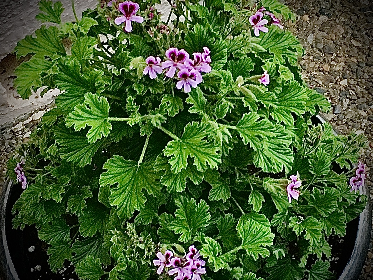 The pink flower is the …Hooded-leaf Pelargonium cucullatum. This is my Scented Geranium Pelargonium graveolens.