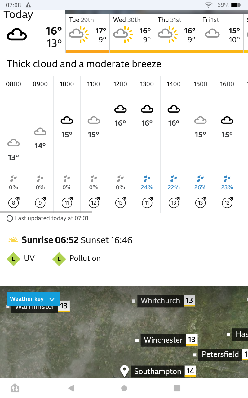Good morning all, misty and light winds temp 9c to 14c Precipitation 0% Sunrise 7.01 Sunset 16.41 No rain is expected today