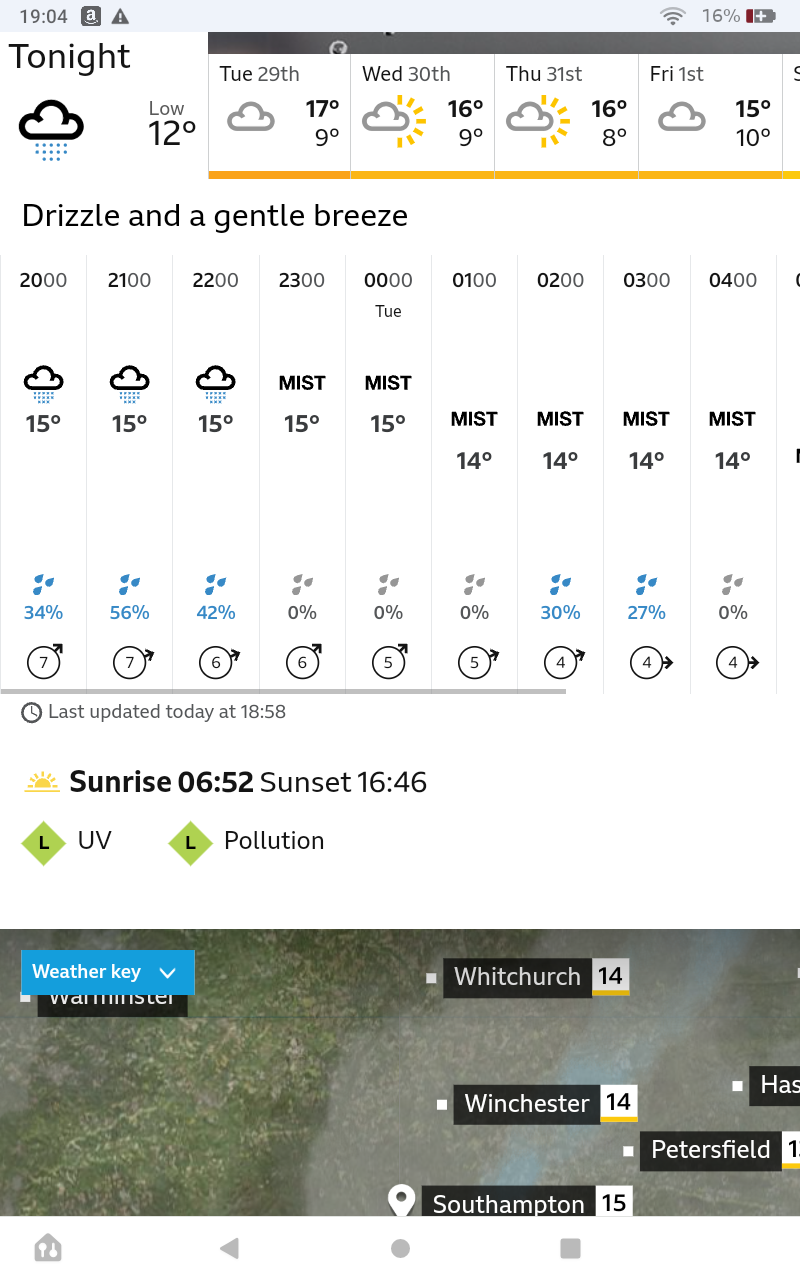Good morning all, light rain and a moderate breeze temp 11c to 14c Precipitation 21% Sunrise 6.57 Sunset 16.45