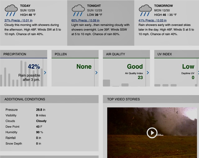 Felt more like fall than winter today. Currently -Partly Cloudy 55°F 13°C Humidity 88% Wind Speed S 10 mph Barometer 29.89 in Dewpoint 52°F (11°C) Visibility 8.00 mi Wind Chill 52°F (11°C) Tonight - Showers, mainly after 7pm. The rain could be heavy at times. Temperature rising to around 53 by 3am. South wind 8 to 14 mph. Chance of precipitation is 100%. New precipitation amounts between a half and three quarters of an inch possible. Monday - Showers, mainly before 7am. Temperature rising to near 54 by noon, then falling to around 48 during the remainder of the day. Southwest wind 10 to 13 mph, with gusts as high as 24 mph. Chance of precipitation is 80%. New precipitation amounts between a tenth and quarter of an inch possible. Monday Night - Mostly clear, with a low around 34. Southwest wind 5 to 8 mph. Tuesday - Increasing clouds, with a high near 51. Calm wind becoming south around 6 mph in the afternoon. Tuesday Night - Rain. Low around 40. Chance of precipitation is 90%. New precipitation amounts between a half and three quarters of an inch possible.