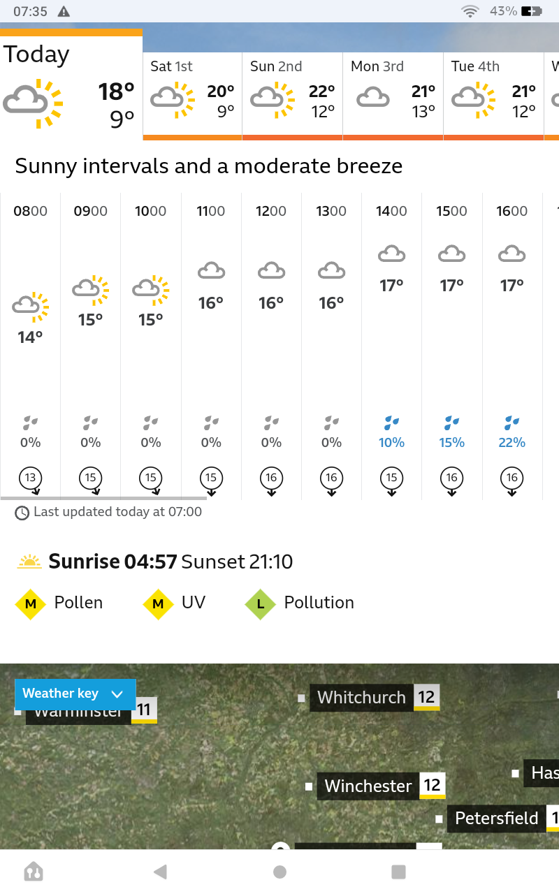 Good morning all, a clear sky and a gentle breeze temp 11c to 16c Precipitation 0% Sunrise 4.52 Sunset 21.19 No rain is expected today
