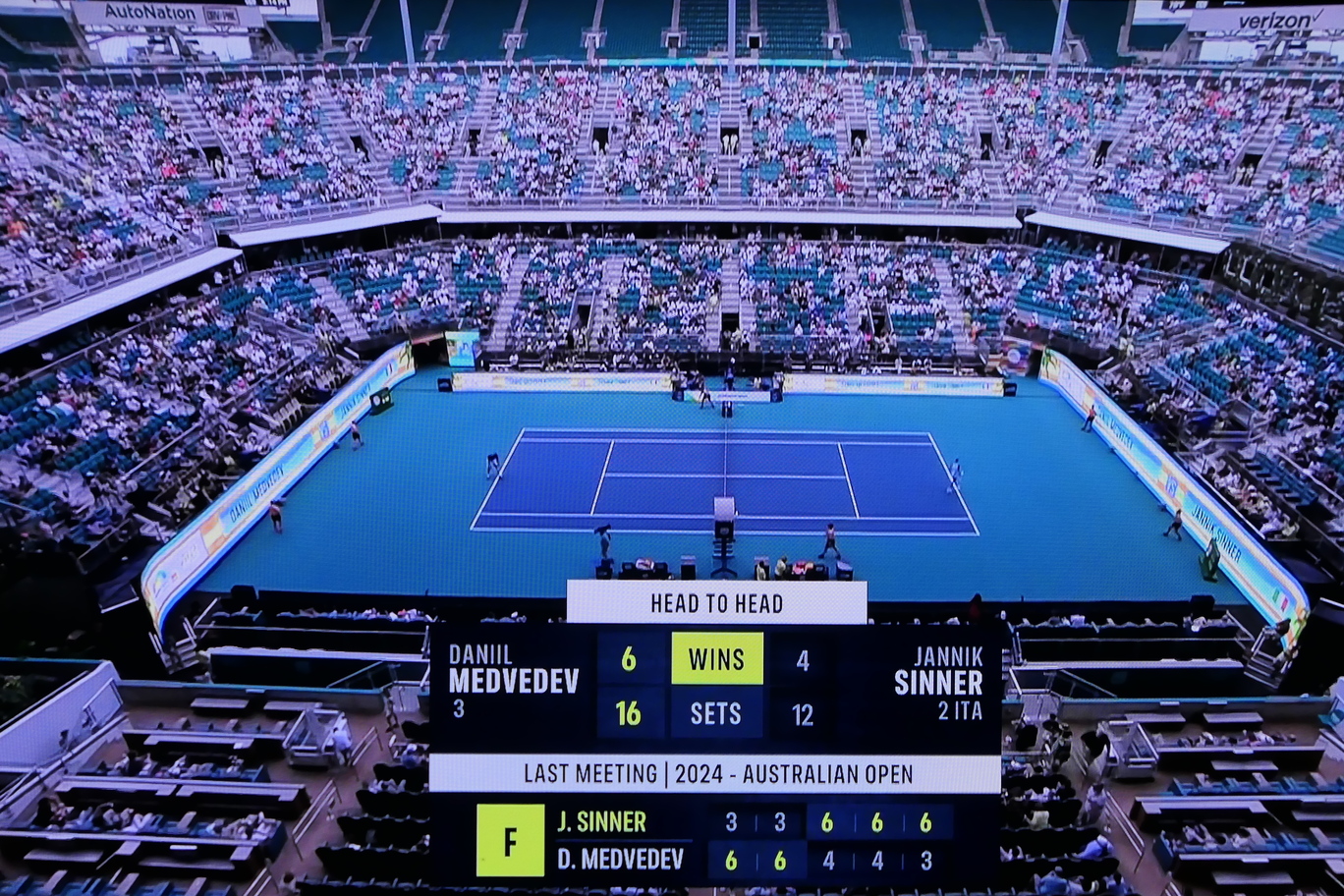 I'm watching the tennis from Miami. I'm impressed with this 14000 seat tennis arena, which has a lot of luxury seating. It's a temporary structure built inside the Hard Rock Stadium, home of the Miami Dolphins American Football team. The green seats at the top are beyond the arena at the end of the stadium. There's two huge TV screens in the corners you can just about see which are for the football supporters during the games. Outside the stadium there's a smaller permanent stadium with several thousand seats and 29 other courts, two with a lot of spectator seats